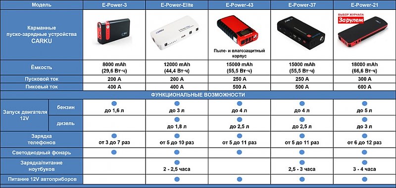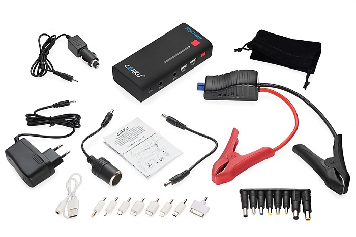 Емкость батареи устройства составляет 15000 mAh (55,5 Вт·ч) — этого хватает на 2,5-3 часа работы ноутбука или 5-11 циклов заряда мобильного телефона. В комплект пуско-зарядного устройства входят интеллектуальные провода, защищающие его от переразряда, короткого замыкания, переполюсовки и противотока.