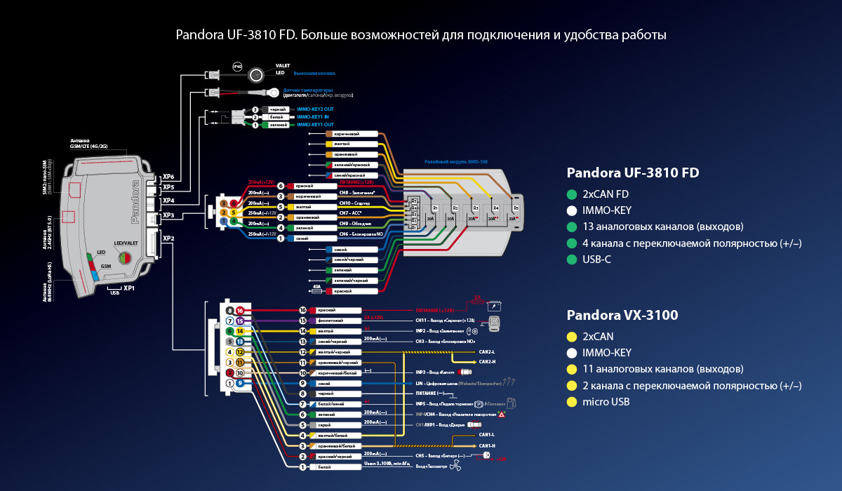 Автосигнализация Pandora UF-3810 FD использует 4G LTE/2G модем, работающий сразу с двумя SIM-картами (Chip-SIM и nano-SIM). Система позволяет временно принудительно включить только