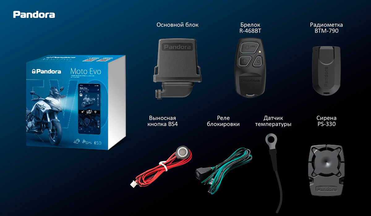 Мотосигнализация Pandora MOTO EVO v2 имеет все необходимое для надежной защиты и полного контроля над мототехникой на любом расстоянии: 4G LTE, GPS, Bluetooth 5.0, герметичный базовый блок и резервный источник питания.