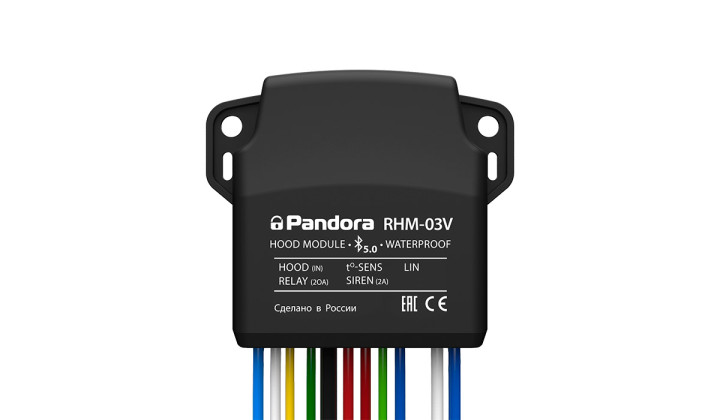 Релейный модуль Pandora RHM-03V работает с оборудованием моторного отсека: он управляет электромеханическим замком капота, блокировкой двигателя, сиреной; управляет и контролирует состояние цифрового подогревателя двигателя, контролирует состояние капота, определяет температуру.